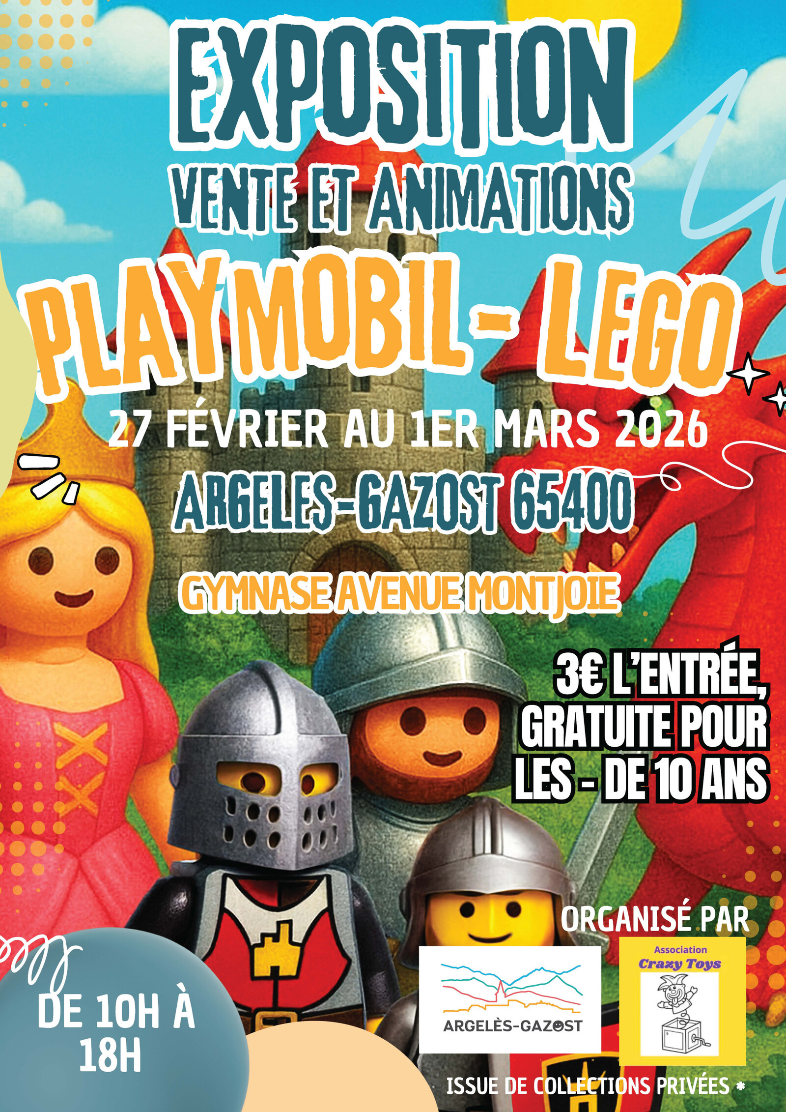 Palymobil - Lego : Exposition - vente - animation27 février au 1er Mars - Gymnase municipal – Avenue Montjoie, Argelès-GazostVenez découvrir des mises en scène spectaculaires, des univers miniatures fascinants qui plairont aux petits et aux grands enfants