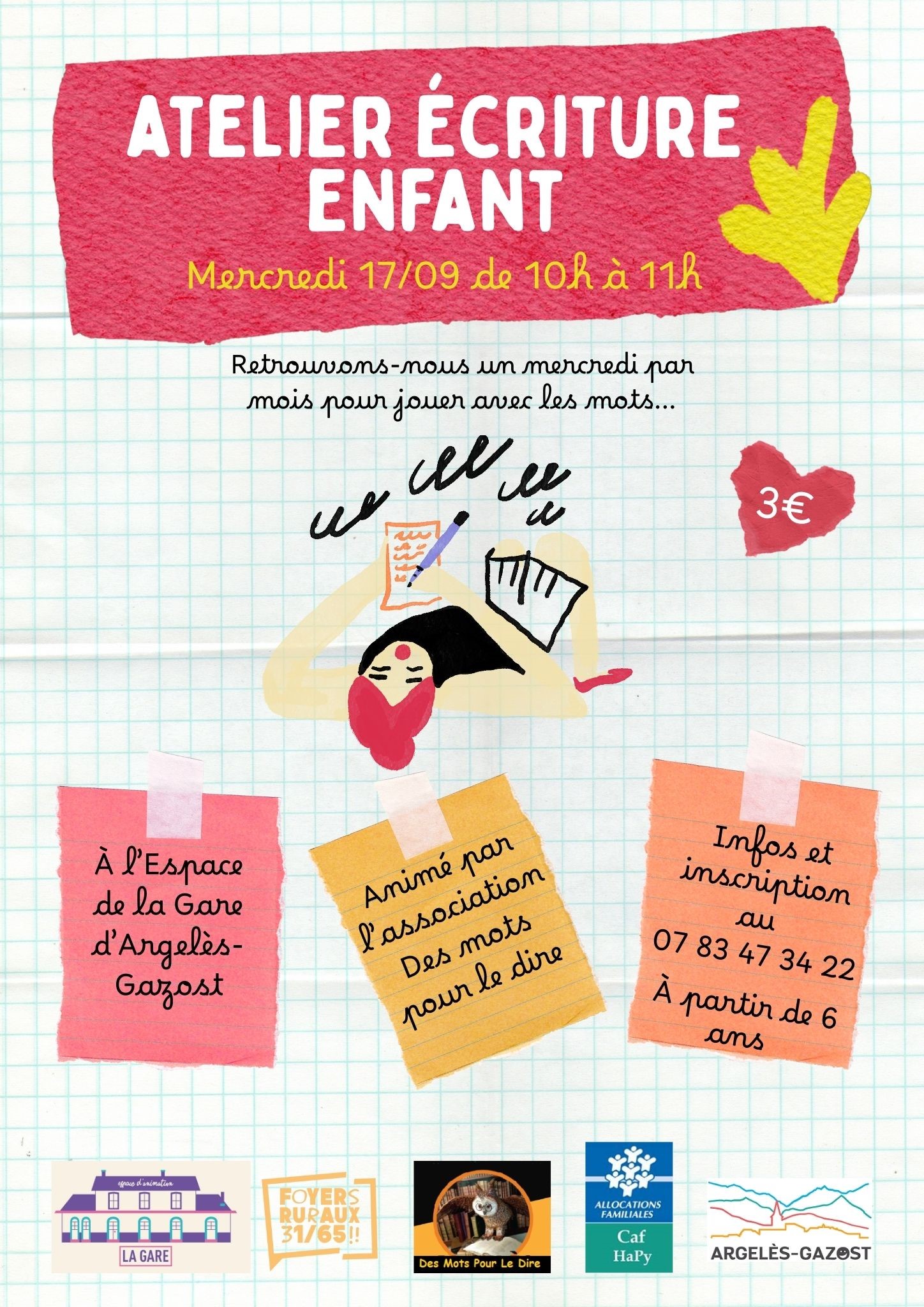 Mercreci 17 septembre de 10h à 11h Atelier d’écriture pour enfants À travers des jeux d’écriture amusants, chacun découvre le plaisir d’écrire et de partager ses idées. Un atelier pour s’amuser avec les mots et repartir avec ses propres histoires. |